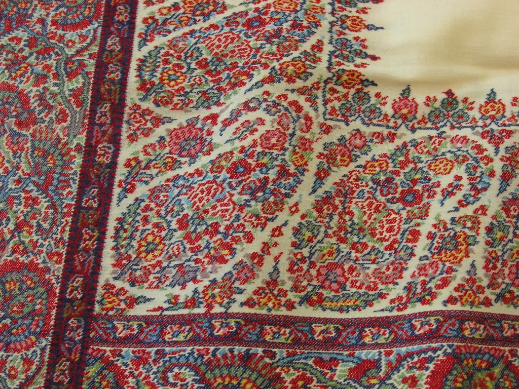 This type of shawl with the border is working Kashmiri embroidery and it is usually used as a casual wear wrap which a woman wears at office or home. This is also used for party wear though.